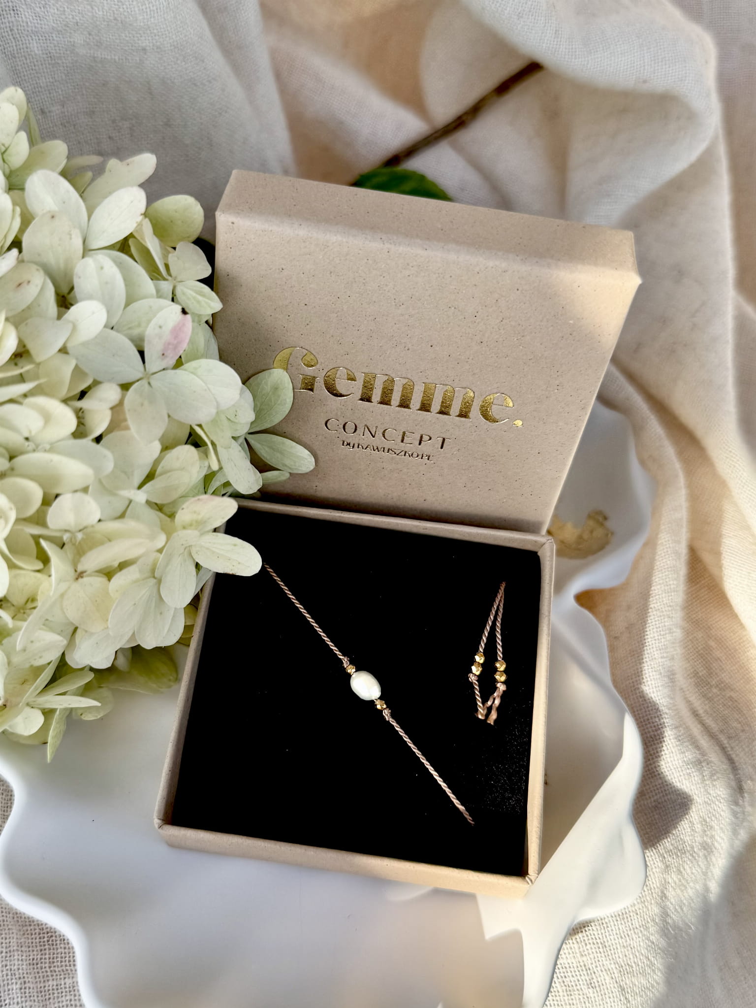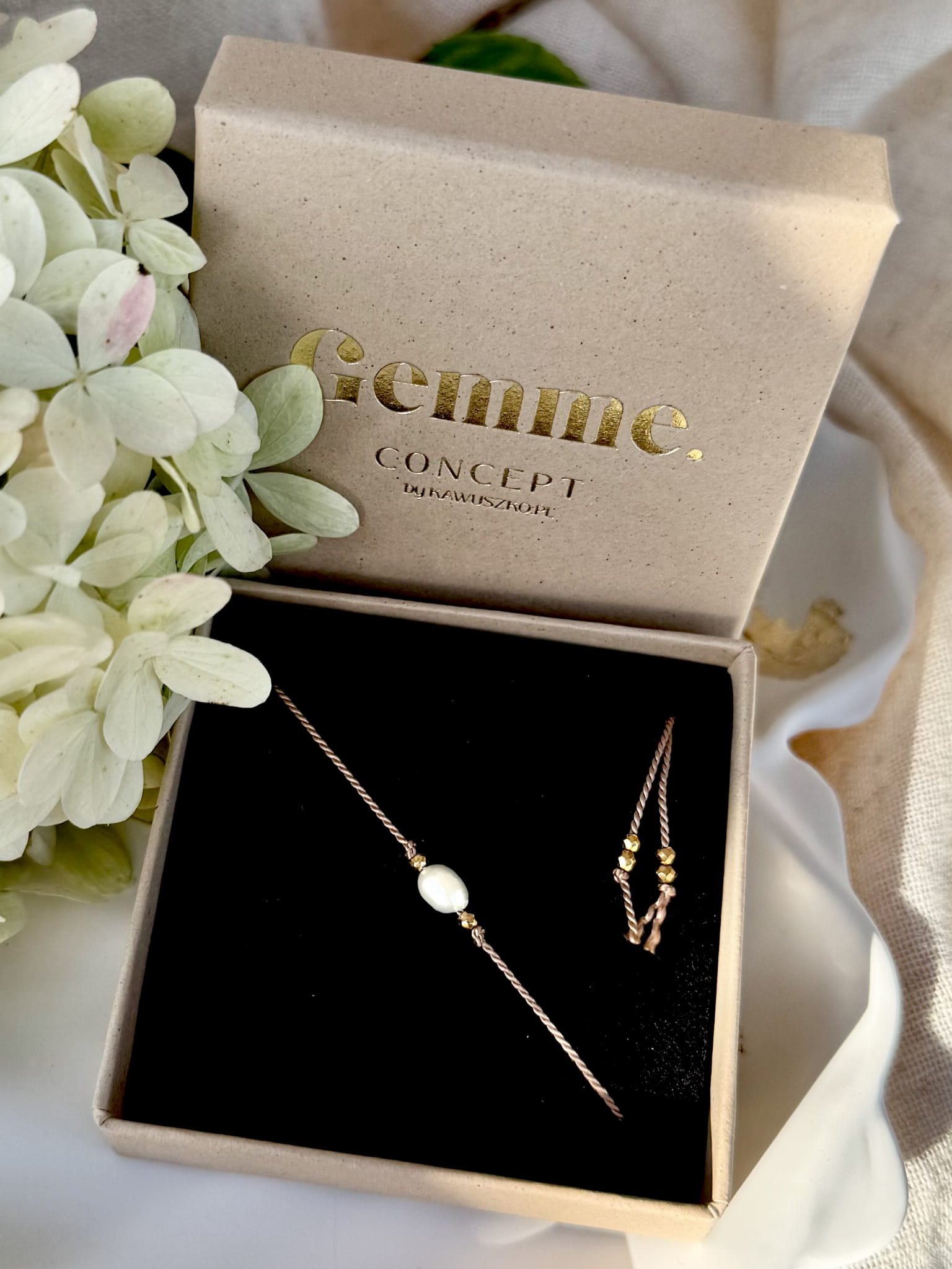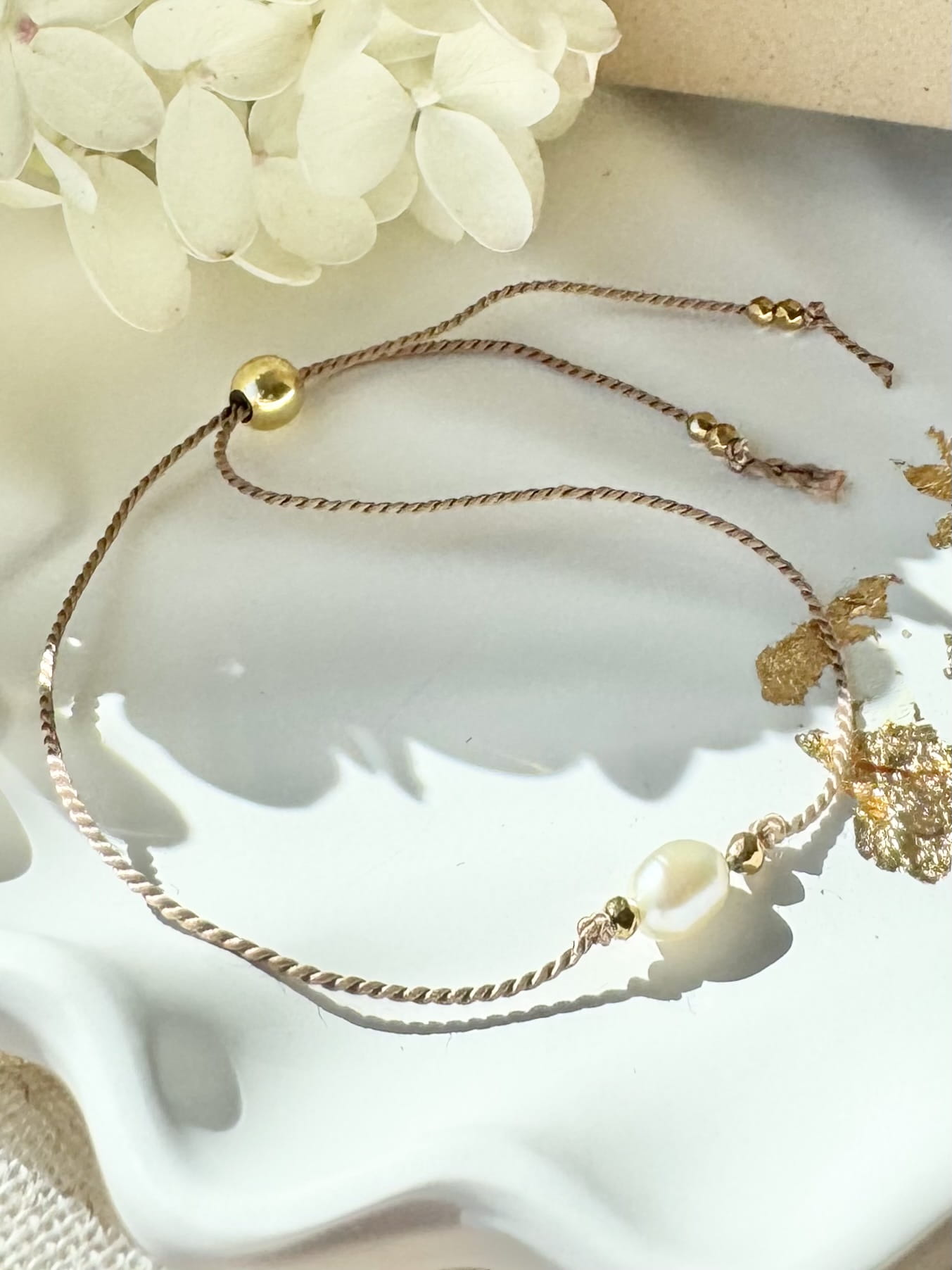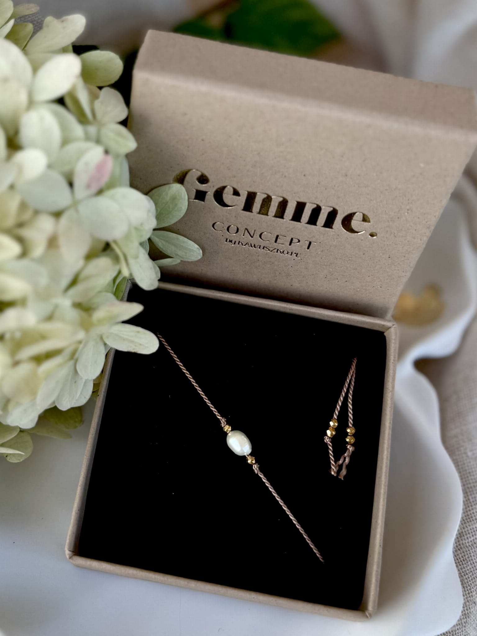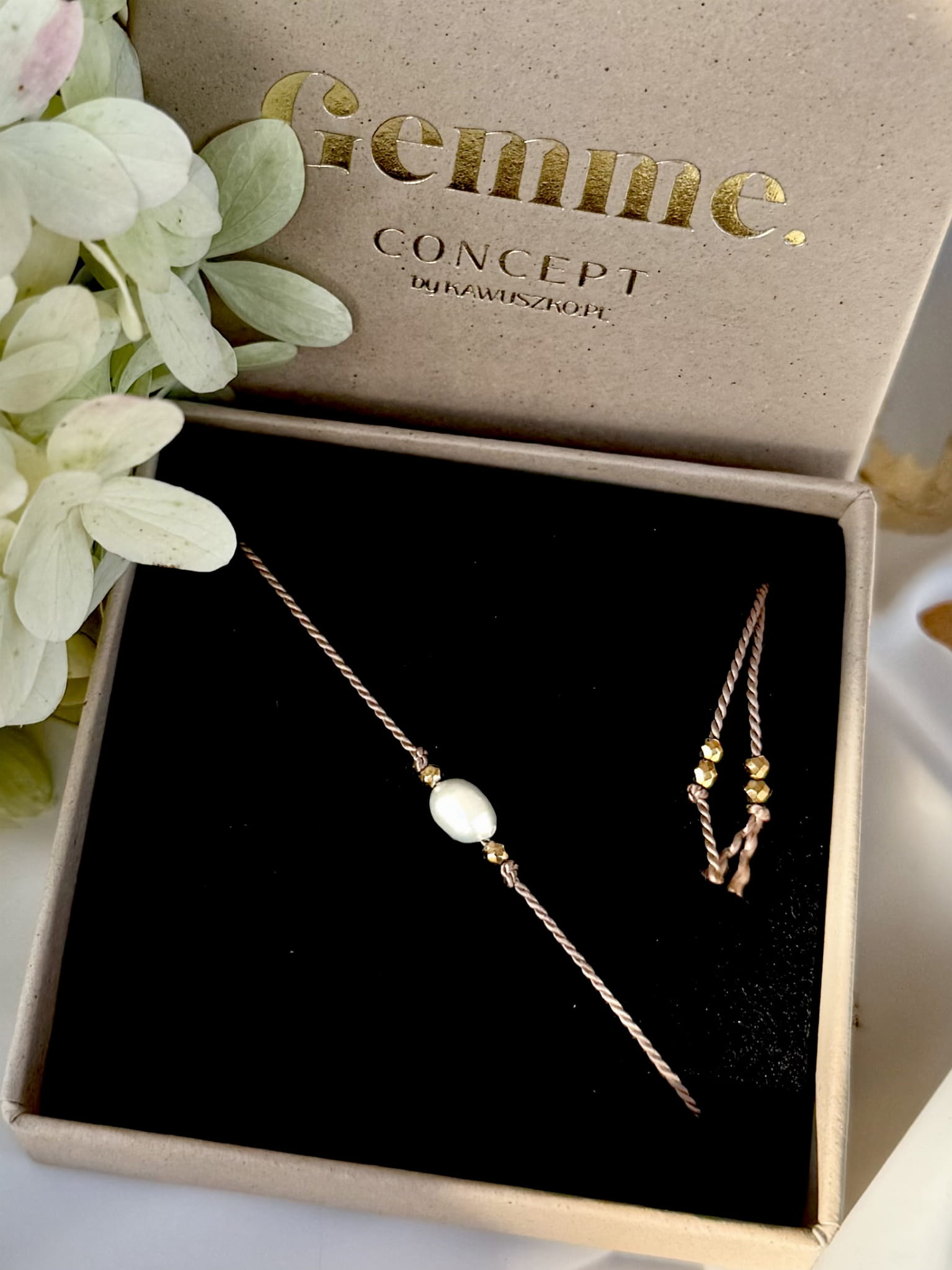 Ta subtelna bransoletka została wykonana z jedwabnej nici w ciepłym odcieniu beżu i ozdobiona pojedynczą, naturalną perełką słodkowodną – symbolem czystości, miłości i kobiecego piękna. Jej lekkość i delikatność sprawiają, że nosi się ją jak szept – ledwo wyczuwalna, a jednak pełna znaczenia.
