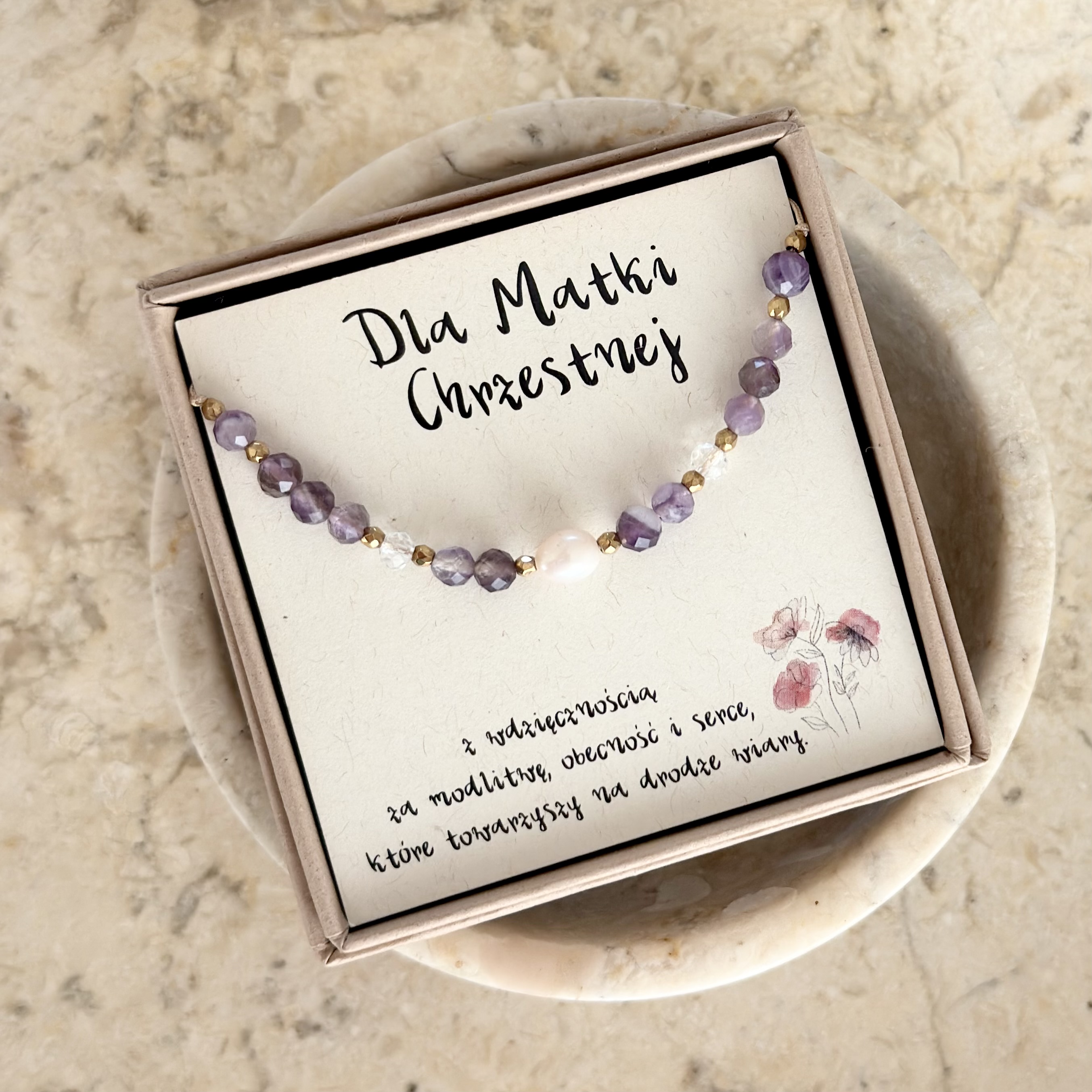 Każdy element tej bransoletki podkreśla jej rolę – ametyst symbolizuje duchowe wsparcie i spokój, kryształ górski harmonię i opiekę, a perła ciepło i dobroć serca.