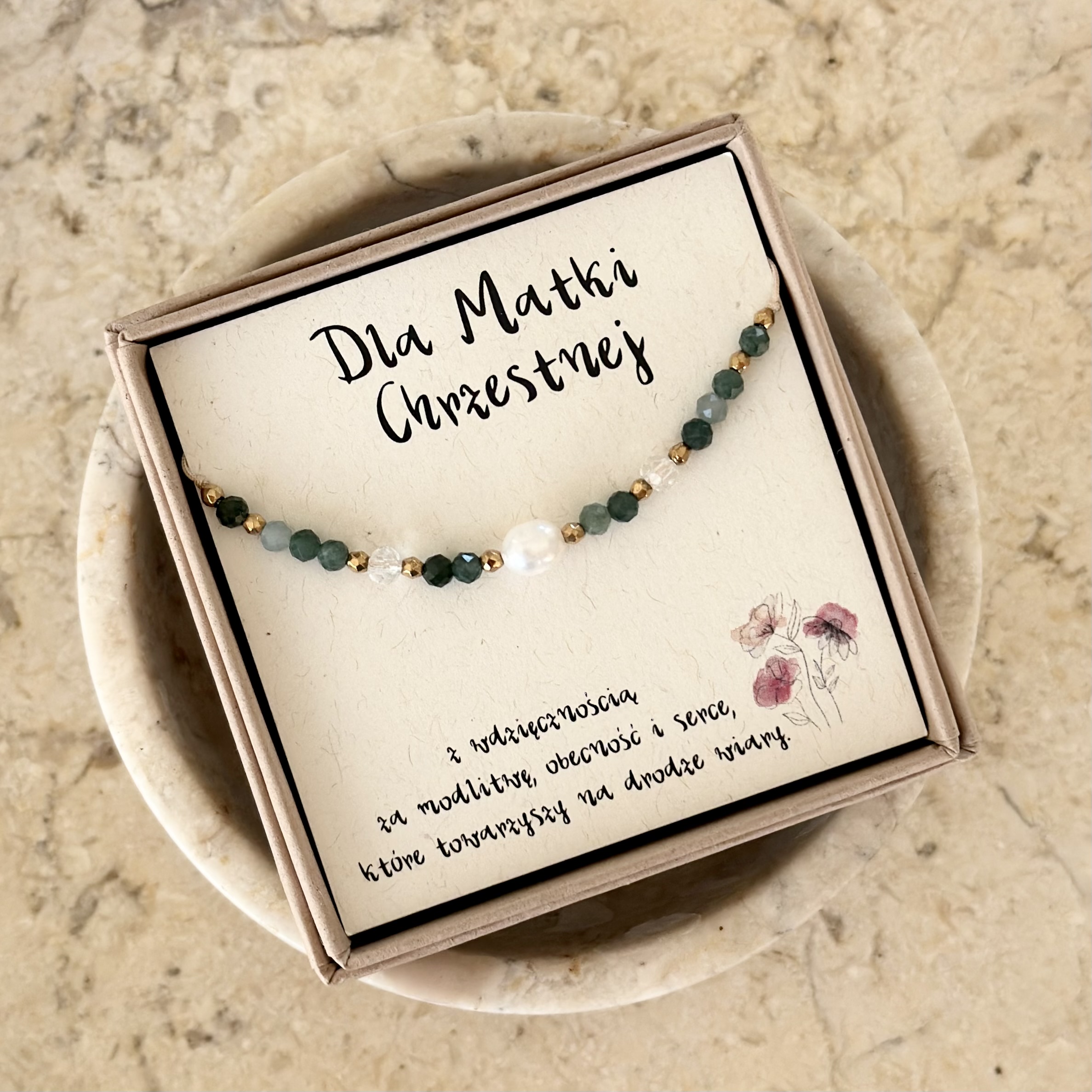 Bransoletka dla Matki Chrzestnej – jaspis szmaragdowy, kryształ górski i perła | podziękowanie dla Matki Chrzestnej na Ślub Komunię Chrzest