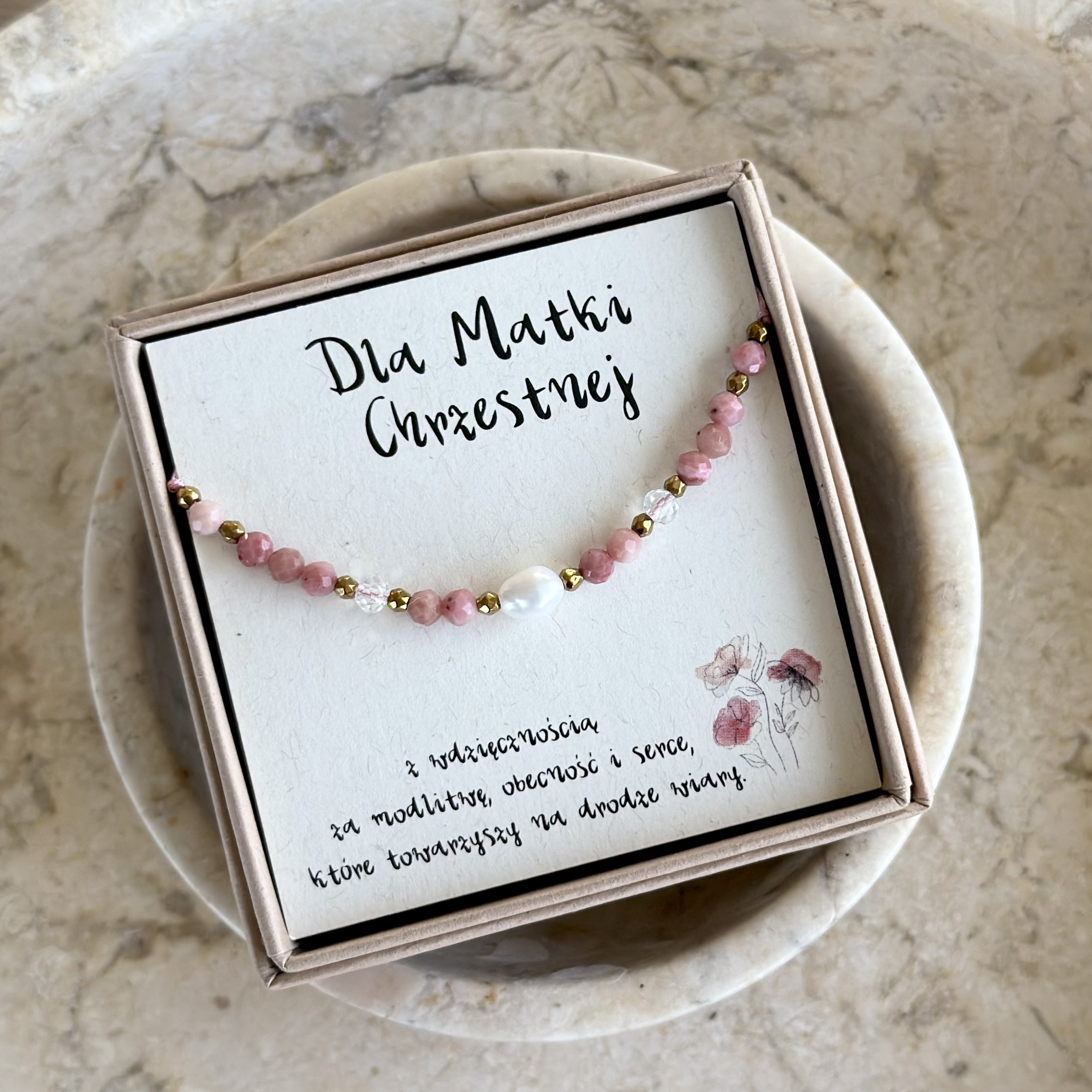 Każdy z kamieni podkreśla jej rolę – rodochrozyt symbolizuje serce pełne miłości, perła duchową czystość i troskę, a kryształ górski harmonię i opiekę, które daje każdego dnia.