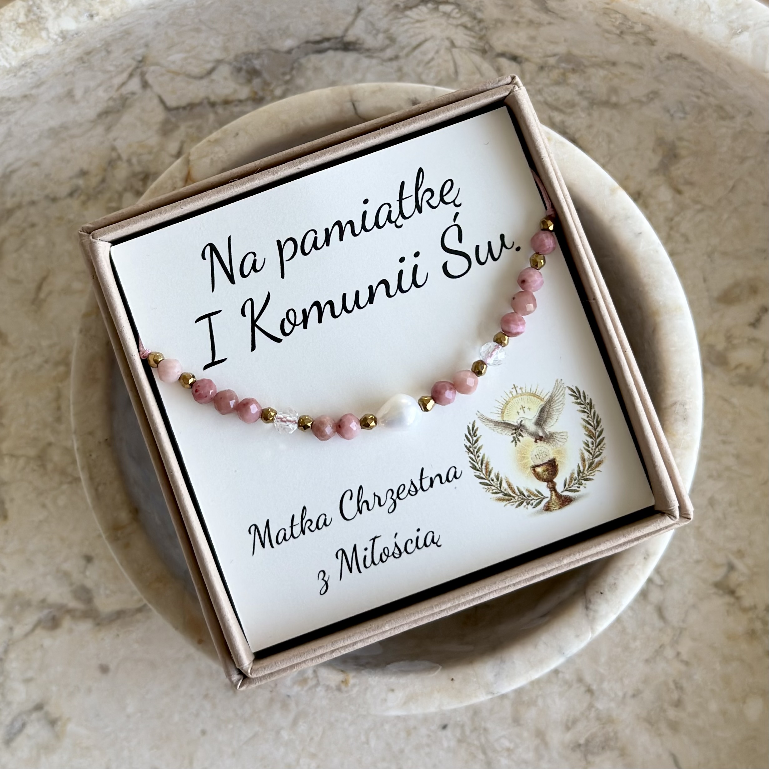 Bransoletka na I Komunię Świętą – rodochrozyt, perła i kryształ górski | prezent od Matki Chrzestnej
