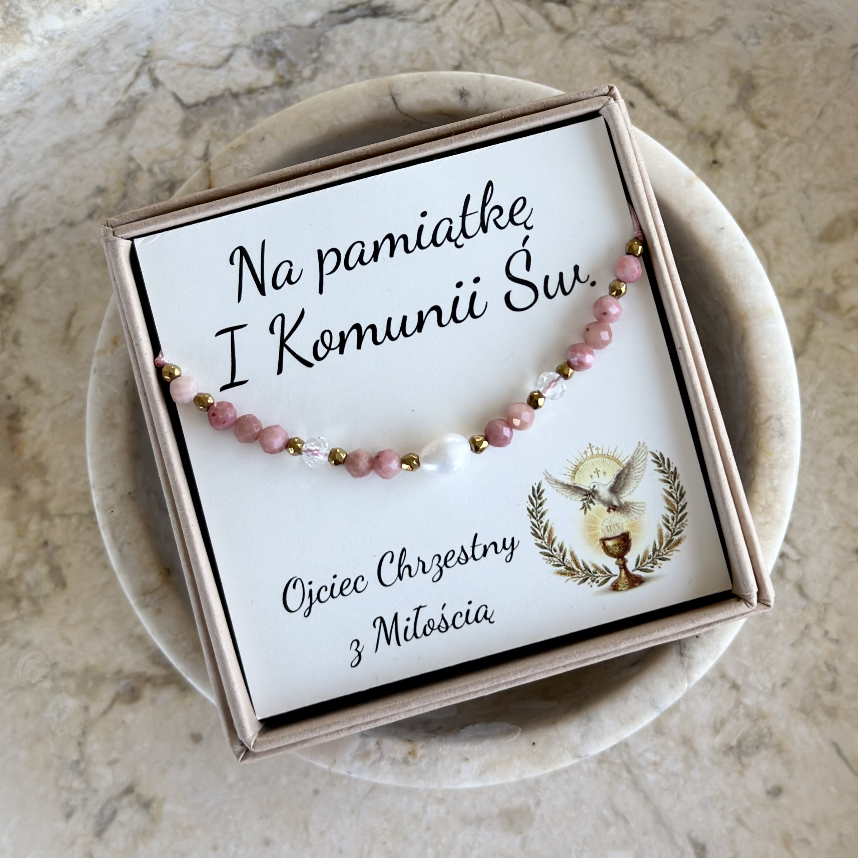 Bransoletka na I Komunię Świętą – rodochrozyt, perła i kryształ górski | prezent od Ojca Chrzestnego