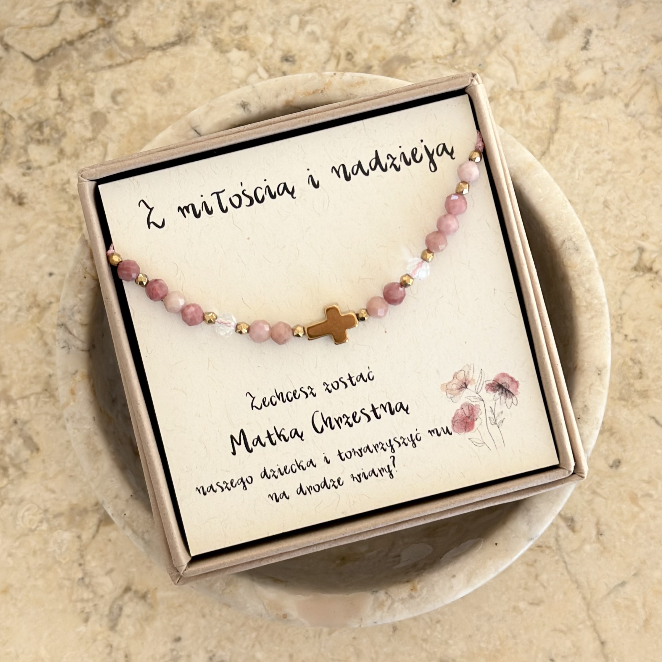 Bransoletka z prośbą o zostanie Matką Chrzestną – rodochrozyt, kryształ górski i złoty krzyżyk hematyt | wyjątkowy prezent