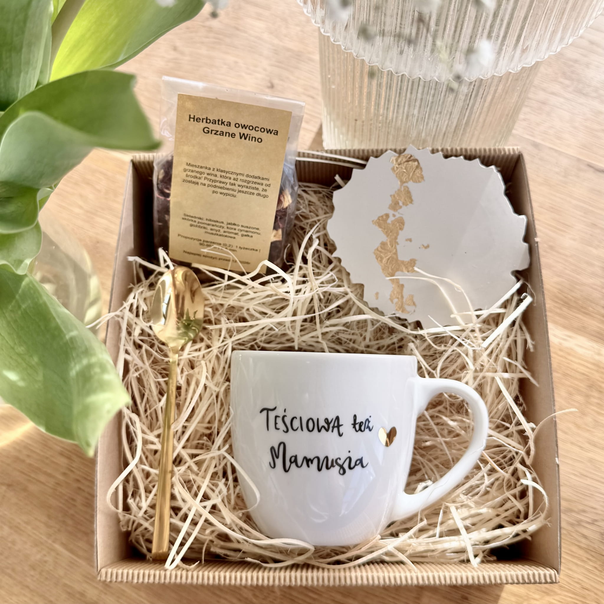 Gotowy Prezent dla teściowej mamy złote serce Kubek + podstawka BOX Prezentowy Teściowa też mamusia podstawka Łyżeczka Prezent na dzień mamy (1)