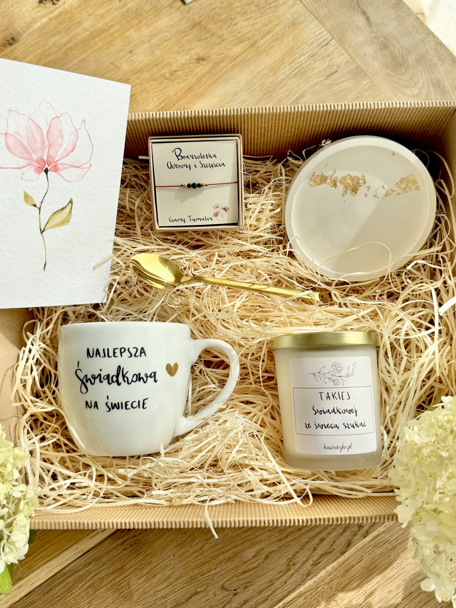 gotowy BOX Prezentowy kubek NAJLEPSZA ŚWIADKOWA NA ŚWIECIE Złote serce BRANSOLETKA Świeca W SZKLE Łyżeczka PODKŁADKA GIPSOWA GRATIS AKWARELOWA KARTKA