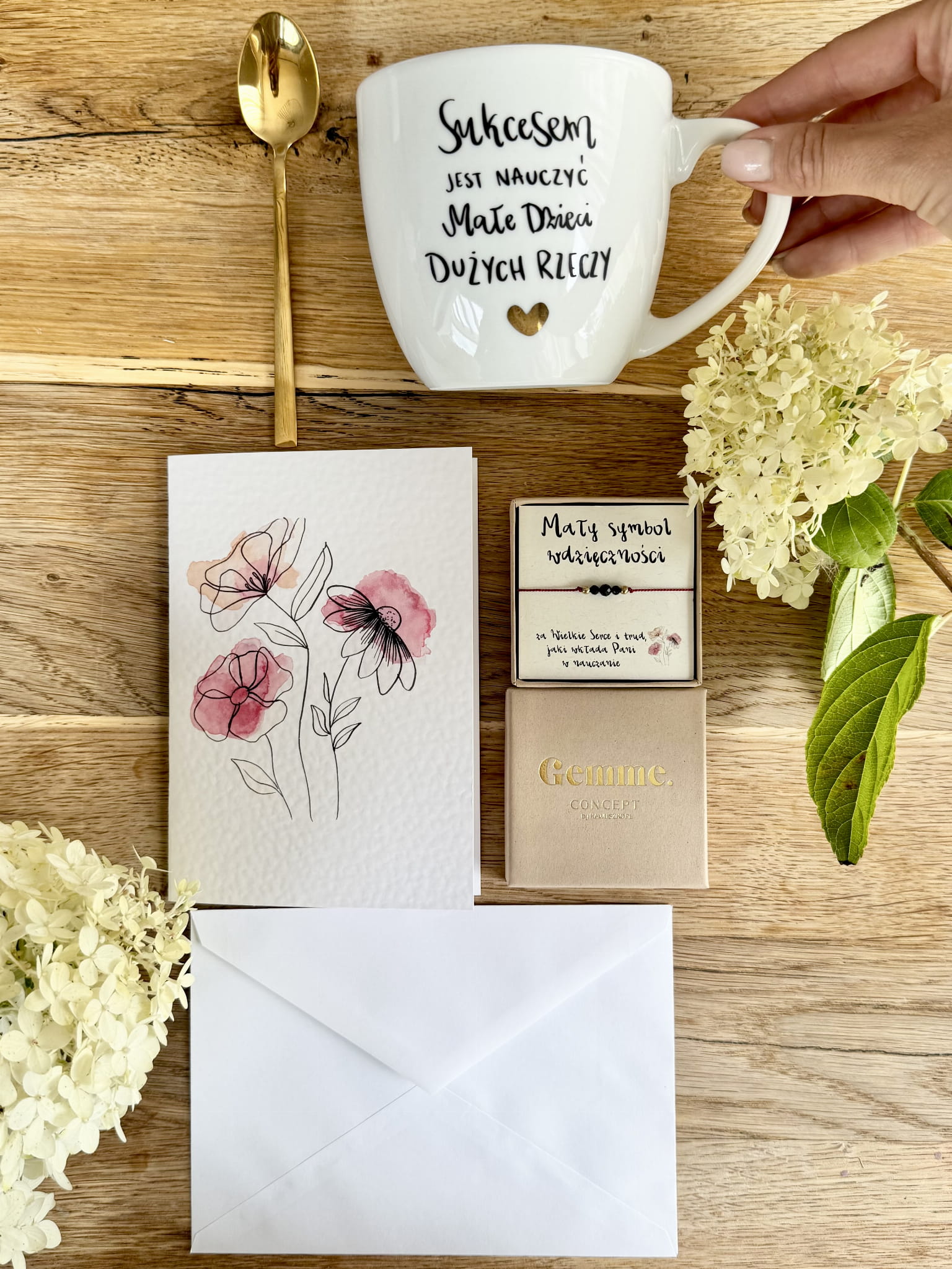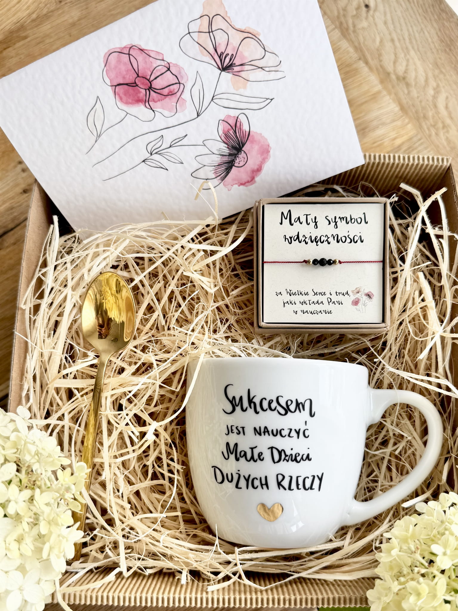 gotowy BOX Prezentowy kubek SUKCESEM JEST NAUCZYĆ MAŁE DZIECI DUŻYCH RZECZY Bransoletka Łyżeczka GRATIS akwarelowa kartka