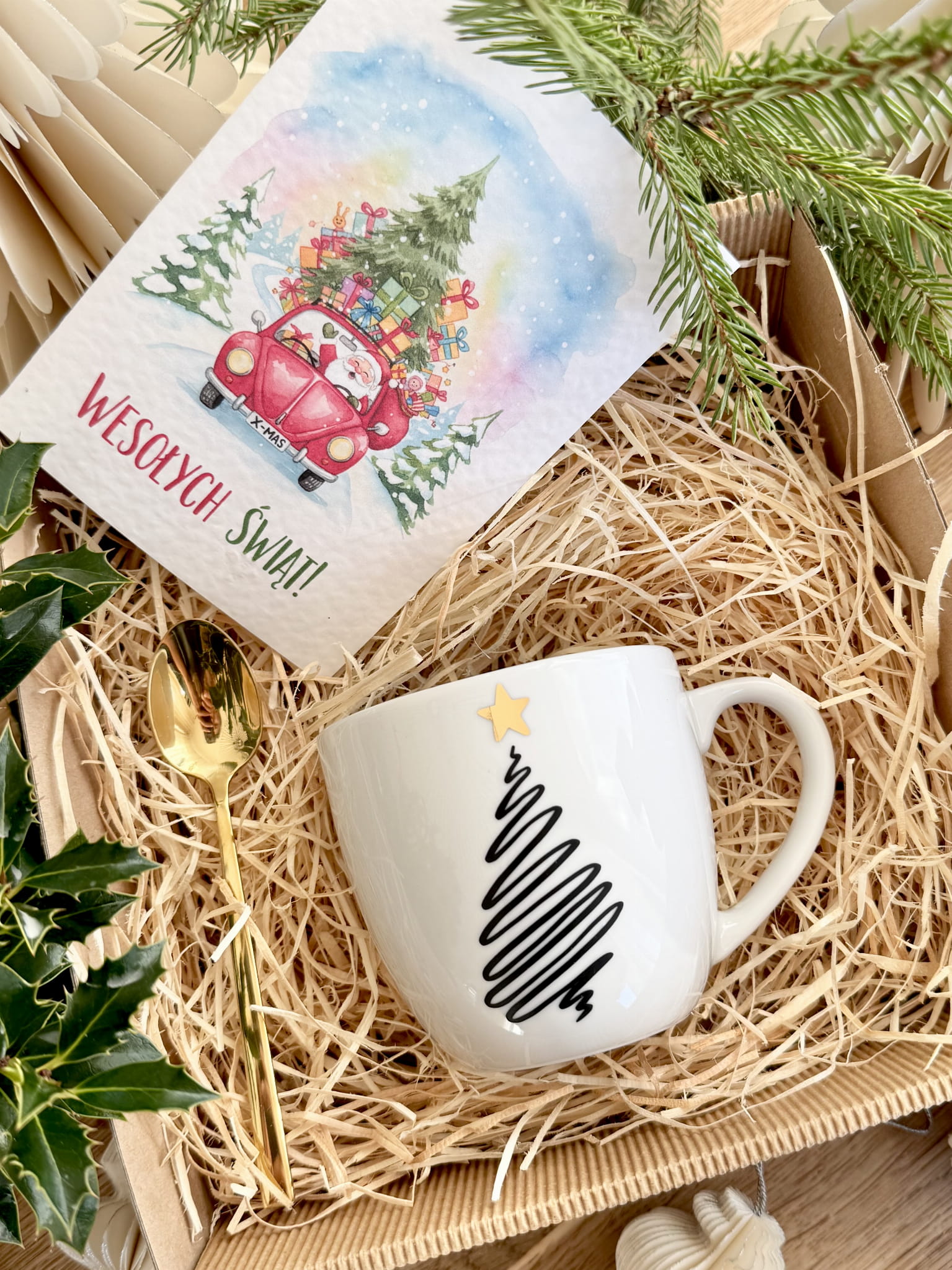 gotowy BOX ŚWIĄTECZNY Prezentowy kubek CHOINKA Łyżeczka Prezent na święta GRATIS KARTA BOŻONARODZENIOWA