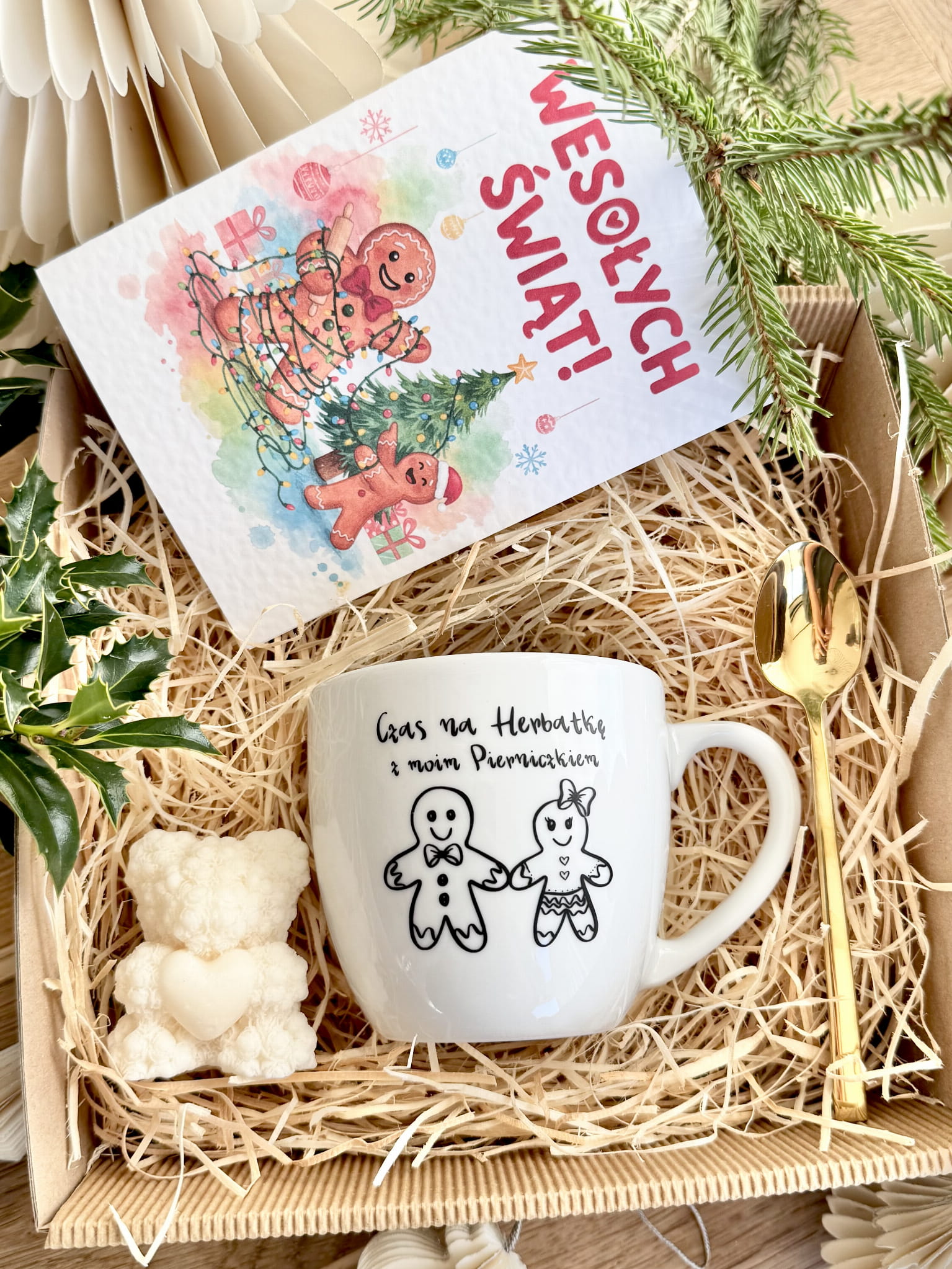 gotowy BOX ŚWIĄTECZNY Prezentowy kubek CZAS NA HERBATKĘ Z MOIM PIERNICZKIEM Łyżeczka Świeczka Prezent na święta GRATIS KARTKA BOŻONARODZENIOWA
