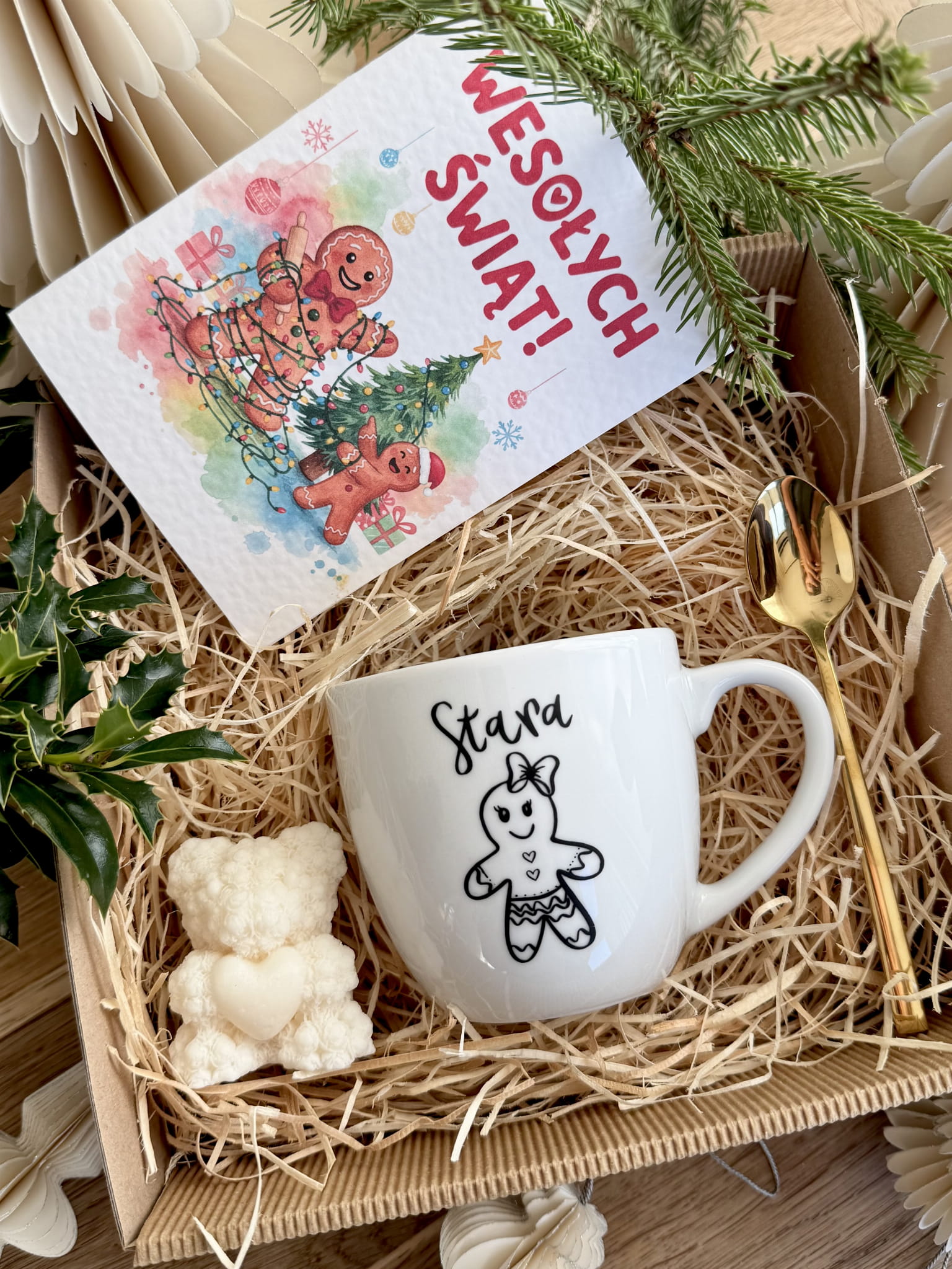 gotowy BOX ŚWIĄTECZNY Prezentowy kubek STARA Łyżeczka Świeczka Prezent na święta z pierniczkiem piernikiem GRATIS KARTKA BOŻONARODZENIOWA