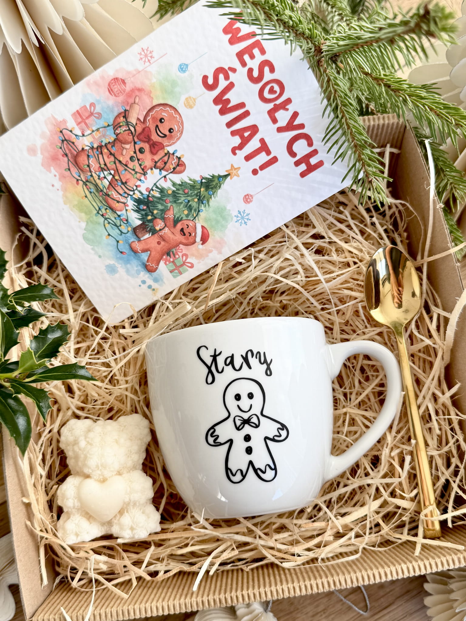 gotowy BOX ŚWIĄTECZNY Prezentowy kubek STARY Łyżeczka Świeczka Prezent na święta z pierniczkiem piernikiem GRATIS KARTKA BOŻONARODZENIOWA
